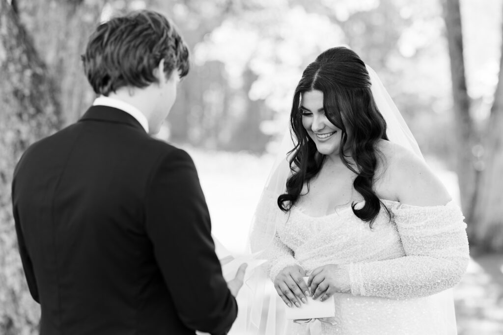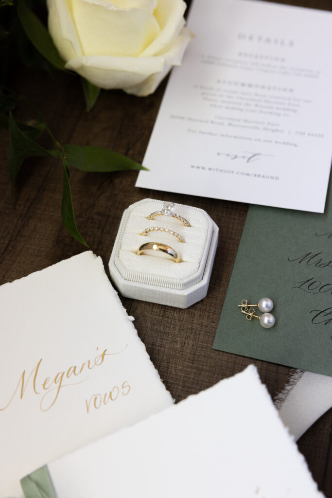 I’ve seen many color palettes, but Megan and Alec’s choice of deep forest green against gold accents was the perfect nod to the coming autumn. From the delicate pearl earrings to the custom-lettered vow booklet, every detail felt intentional.